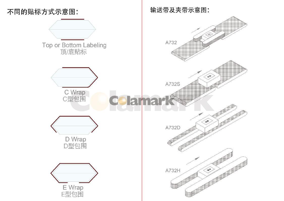 A732系列有多種配置變化適應不同的應用要求,通用型號A732提供上下貼標兩組送標器,獨立進出輸送帶,及中間夾帶輸送以實現上下兩個平面同時貼標,夾帶輸送方式保證了貼標穩(wěn)定,不受物品重量及厚薄影響,避免貼標位置盲區(qū),并允許C及D型的包圍貼標。A732同時提供多種變化的物料輸送方式來實現頂/底面同時貼標的要求,包括兩段輸送帶、雙平行輸送帶、延長夾帶等等。 平面貼標機