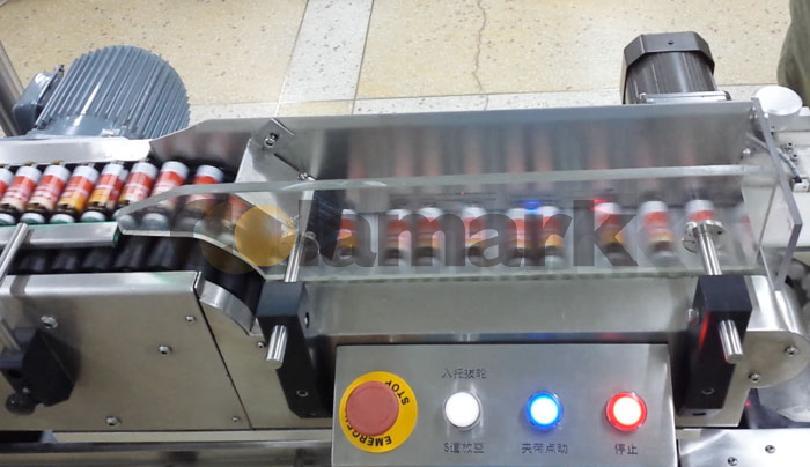 臥式圓瓶貼標機+臥式入托機+對角封口貼標機應用
