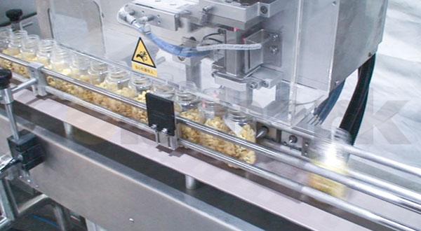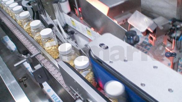 高速理瓶機采用轉(zhuǎn)盤結(jié)合氣吹轉(zhuǎn)瓶方式,簡單快捷地將凌亂的塑料瓶整理好,并整齊有序地輸送到瓶裝線上,通過分瓶機構(gòu)輸送至視覺數(shù)粒機下;數(shù)粒機檢測到瓶子后,根據(jù)用戶設(shè)置的瓶裝數(shù)量將藥片高速填裝;而后經(jīng)過干燥劑投放工位,干燥劑投料機把成卷狀的干燥劑包分切成單包狀態(tài)并投入到瓶子中,之后輸送到旋蓋工位。此時旋蓋機旁的來料檢測電眼檢測到瓶裝完成的物料,同步向瓶子下蓋,接著旋蓋機采用多對旋緊輪把瓶蓋逐步旋緊,同時對旋蓋不到位的瓶子進行檢測剔除,保證了旋蓋機的輸出質(zhì)量。此時,旋蓋后的瓶子經(jīng)過磁感鋁箔封口機進行鋁箔封口 。隨后便通過稱重工位進行測重。達爾嘉數(shù)粒瓶裝系統(tǒng)所搭配的稱重檢測系統(tǒng)均是世界知名品牌,精度極高,進一步的保證了數(shù)粒裝瓶時在數(shù)粒數(shù)量上的正確率,不達標的產(chǎn)品將被自動剔除。達標后的瓶子進入貼標工位的緩沖區(qū),然后再進入立式貼標工位。貼標工位方面客戶可以根據(jù)自身需求選配不同的機構(gòu)模塊,如賦碼標識(生產(chǎn)日期賦碼、可用于溯源的二維碼、條碼)、賦碼檢測、賦碼掃描采集等等。同時亦可根據(jù)客戶需求量身定制。