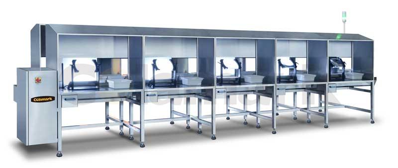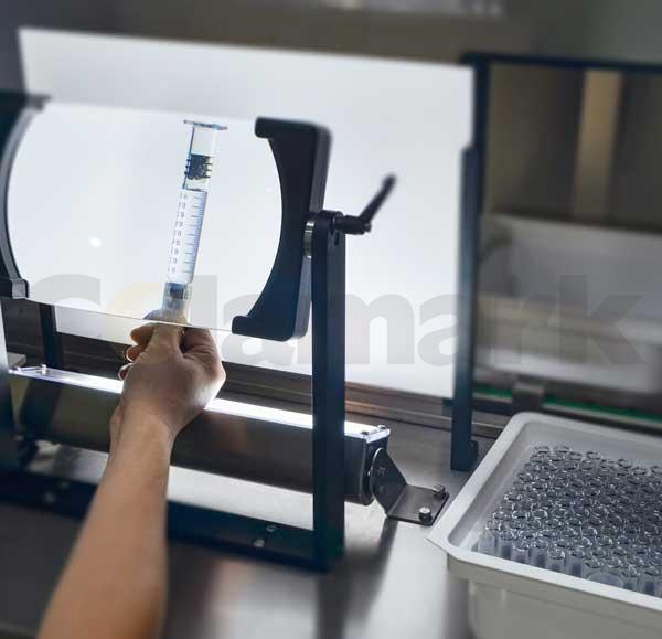 適用于西林瓶、安瓿瓶、預充針管等物料的半自動燈檢,物料通過進料輸送帶有序排列在輸送帶上并自轉前進,在檢視工位檢視者通過低倍放大鏡可準確地檢查出產品的各種缺陷。可作雙工位、四工位、六工位......雙倍工位疊加,分流及匯流連線布局設計。